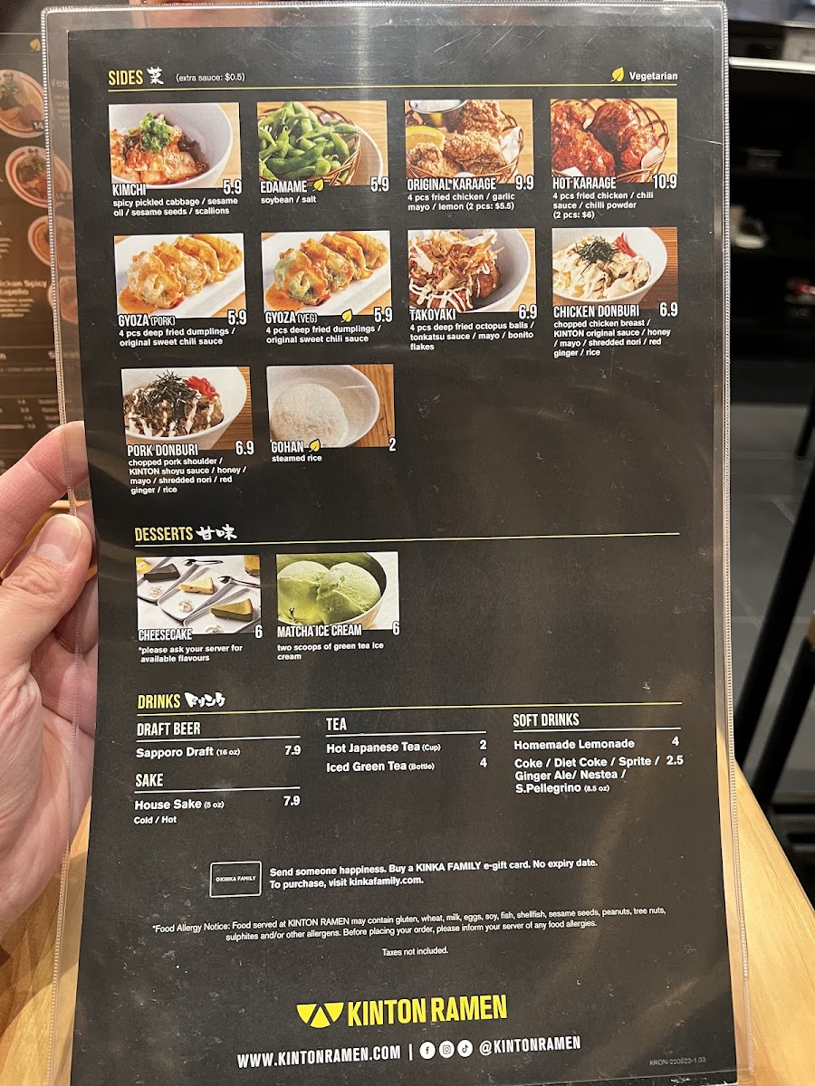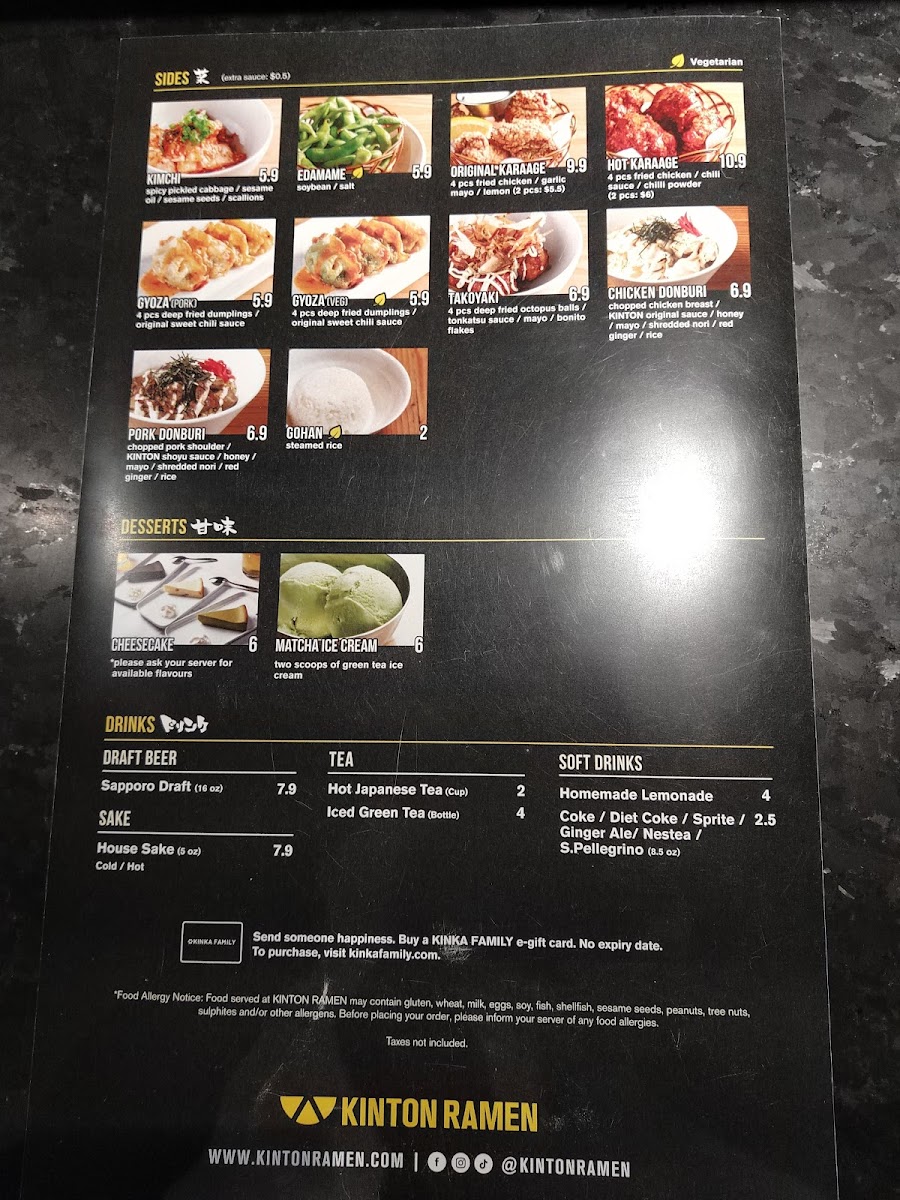 No meal is complete without dessert, and Kinton Ramen Oakville - East offers a variety of cheesecakes to satisfy your sweet tooth. Pair your meal with a S.Pellegrino or Kinka Ramune for a refreshing beverage, or opt for a Sapporo Premium Beer for an added kick.